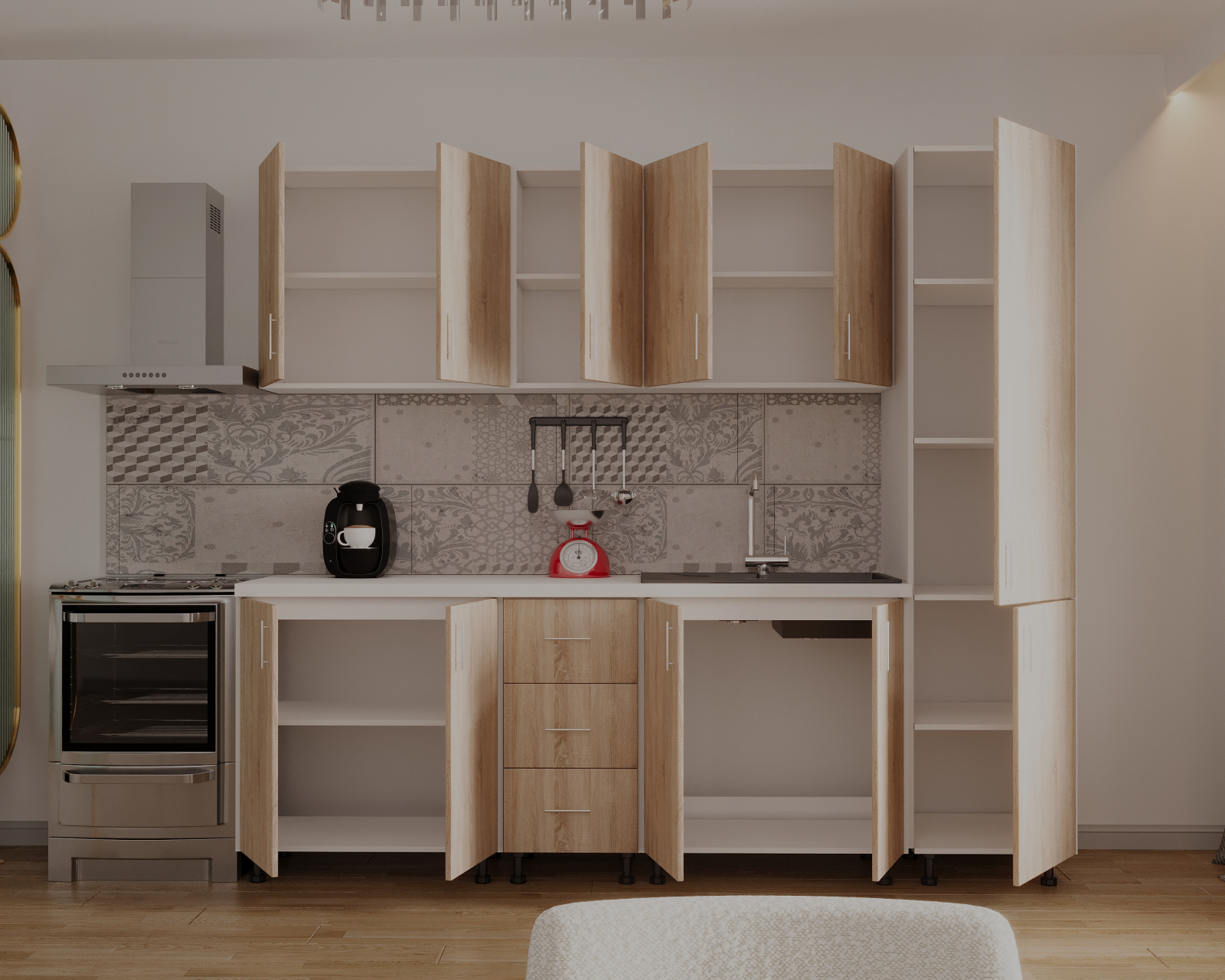 Descopera aceasta bucatarie cu spatiul bine organizat si finisajele de calitate, ce iti ofera un mediu perfect pentru a-ti pune in valoare abilitatile culinare.O oportunitate unica pentru cei care cauta echilibrul perfect intre estetica si utilitate in inima casei sale.