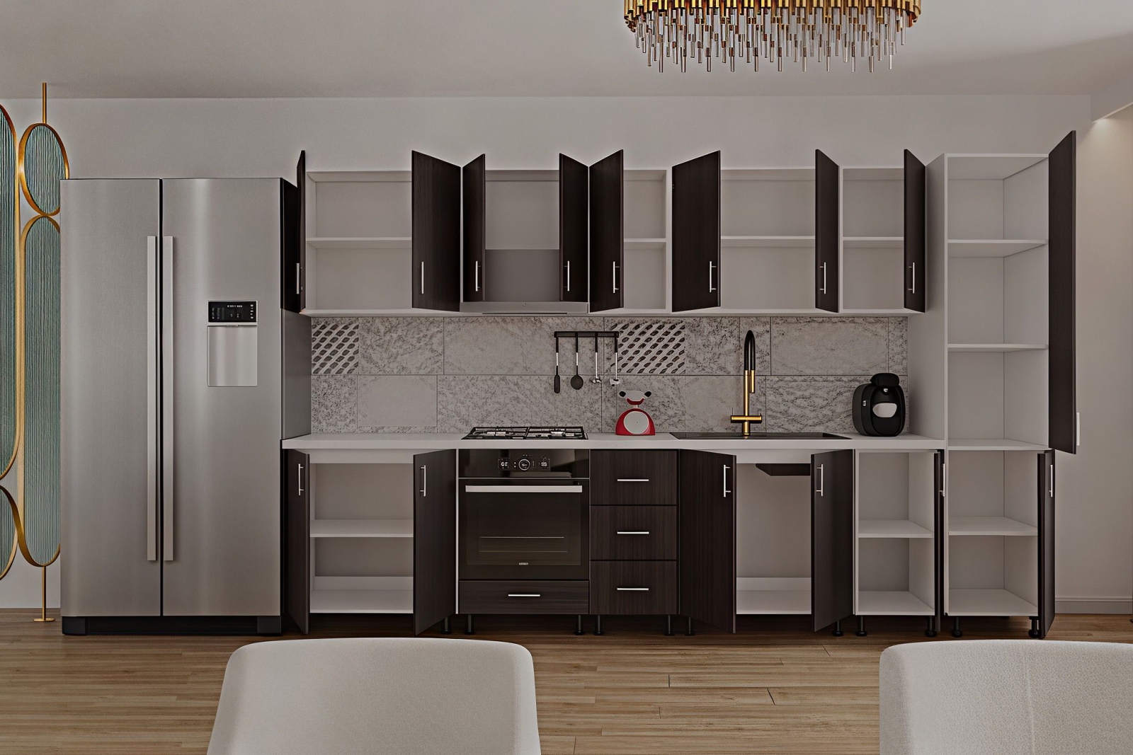 Descopera aceasta bucatarie cu spatiul bine organizat si finisajele de calitate, ce iti ofera un mediu perfect pentru a-ti pune in valoare abilitatile culinare.O oportunitate unica pentru cei care cauta echilibrul perfect intre estetica si utilitate in inima casei sale.