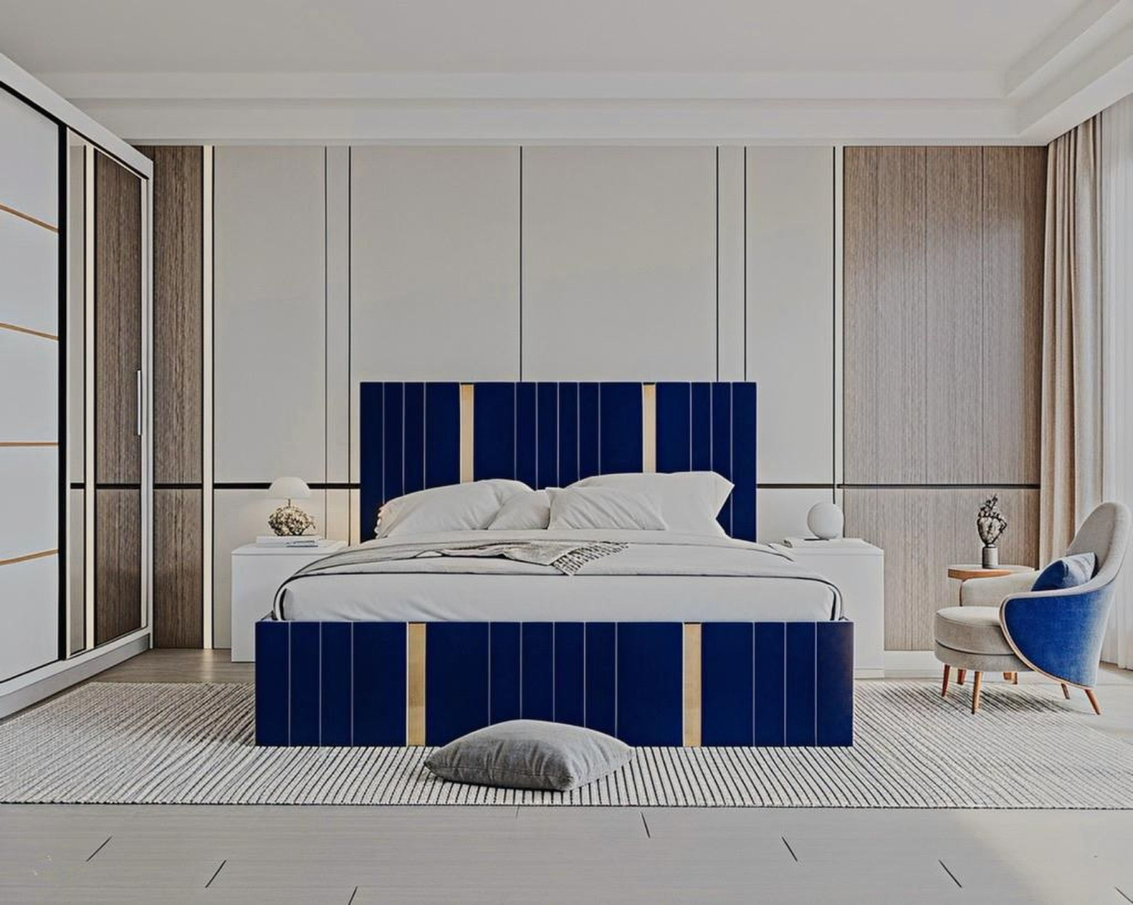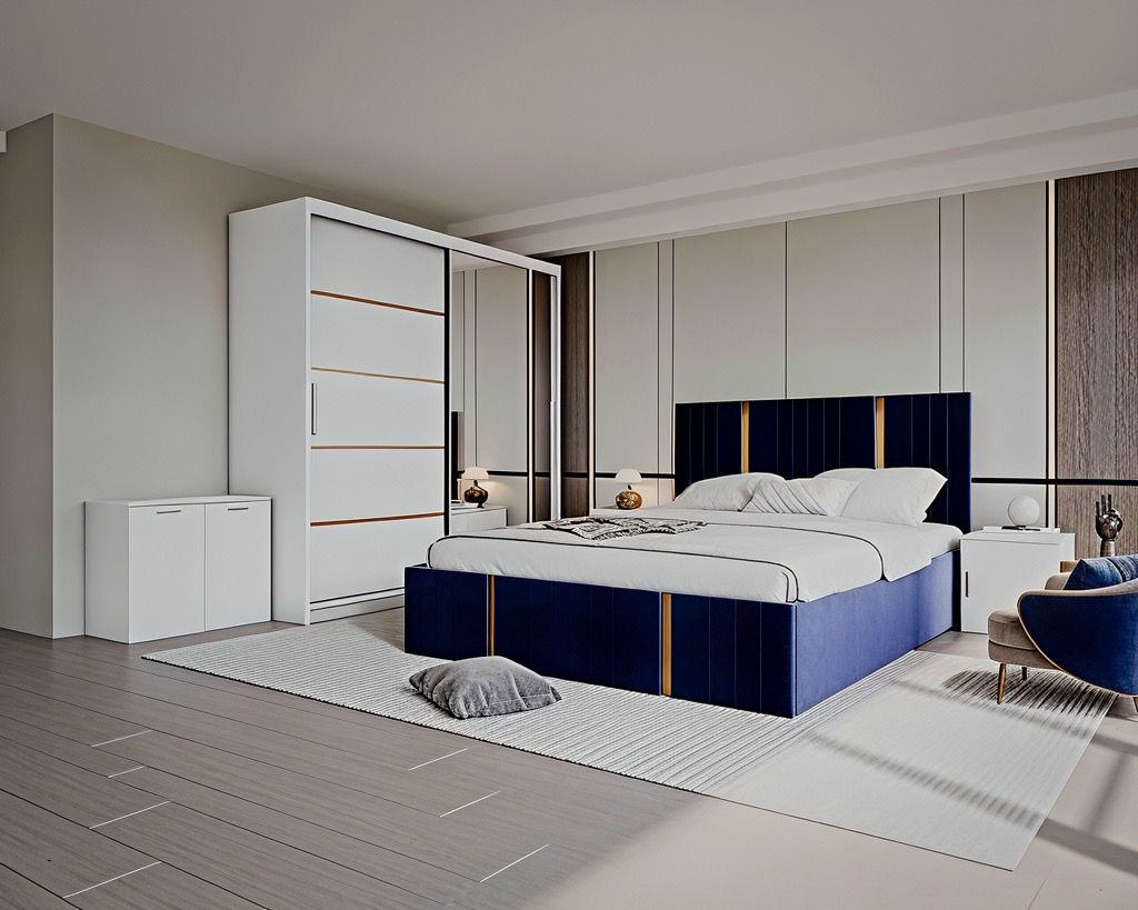 Mobysa Set Dormitor Sebastian auriu cu oglinda, Pat 160x200cm, Albastru + Alb, Pal 18 mm