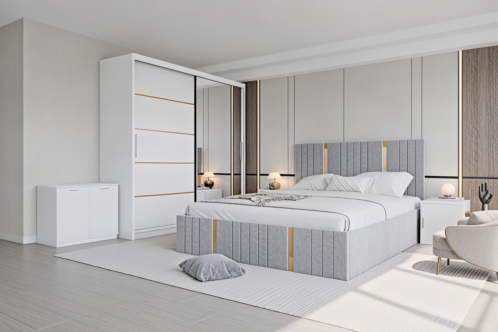 Mobysa Set Dormitor Sebastian auriu cu oglinda, Pat 160x200cm, Gri deschis+ Alb, Pal 18 mm