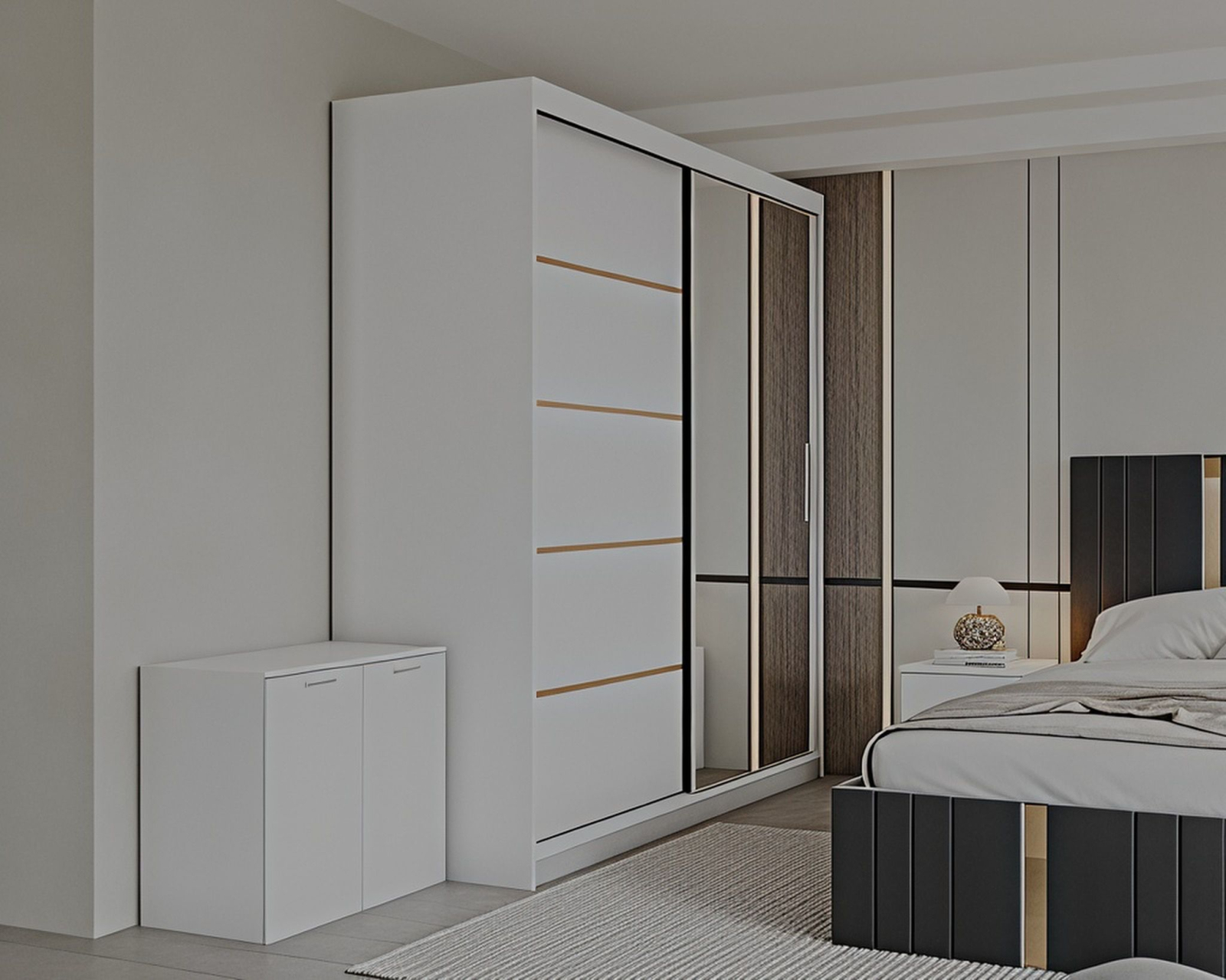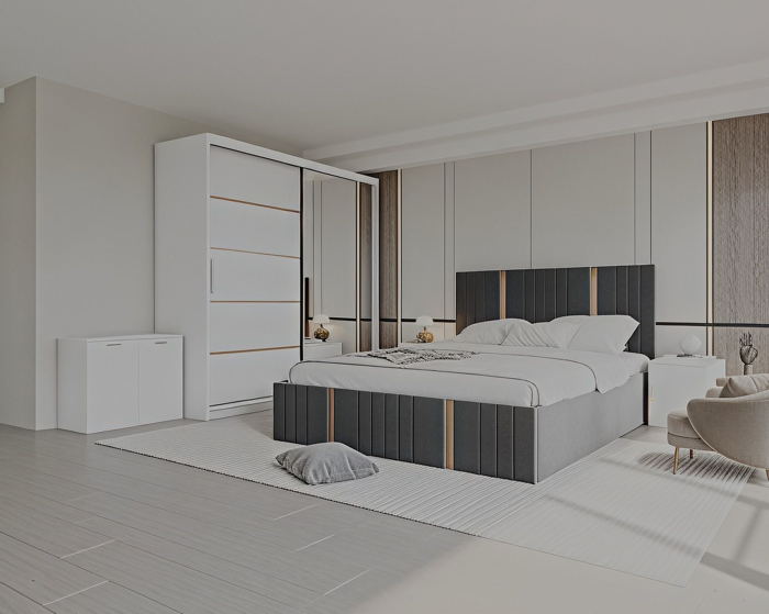 Mobysa Set Dormitor Sebastian auriu cu oglinda, Pat 160x200cm, Gri inchis + Alb, Pal 18 mm