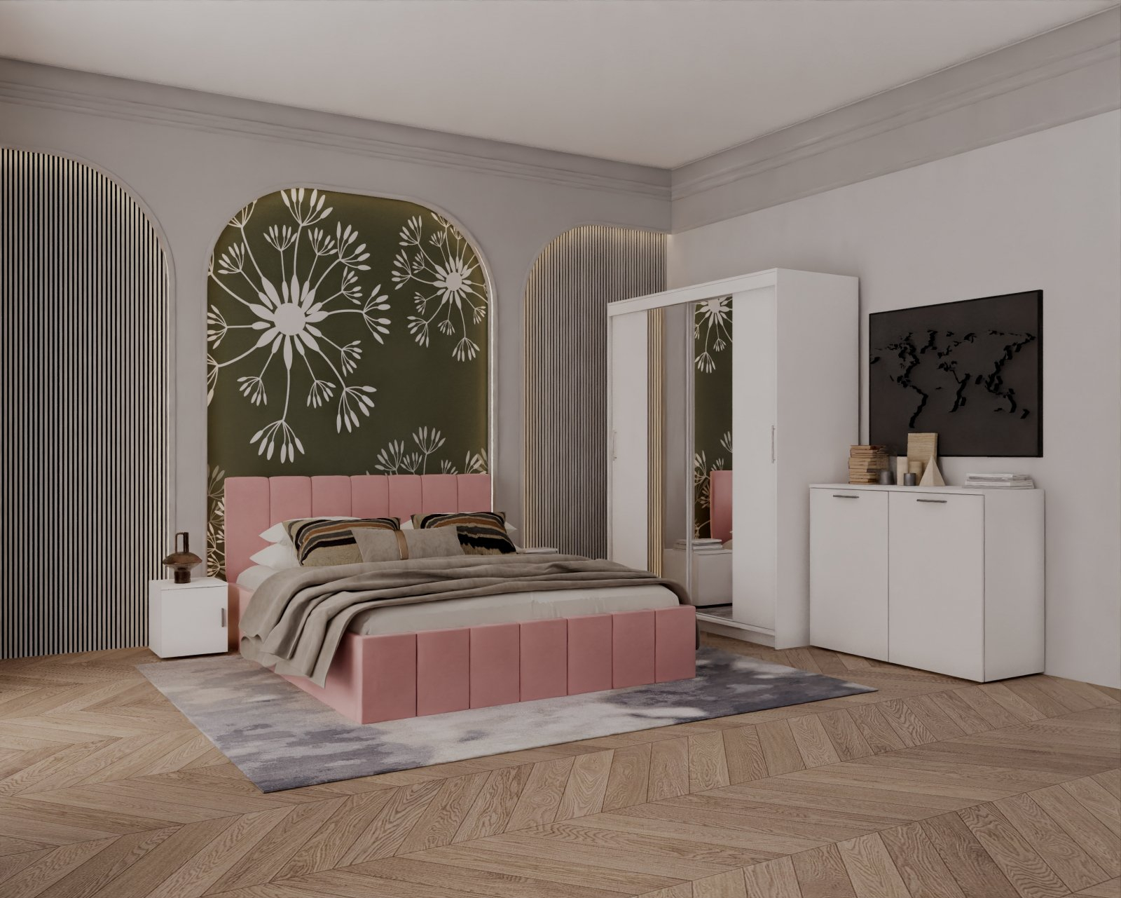 Mobysa Set Dormitor Alex cu oglinda, 160x200cm, Roz + Alb, Pal 18 mm