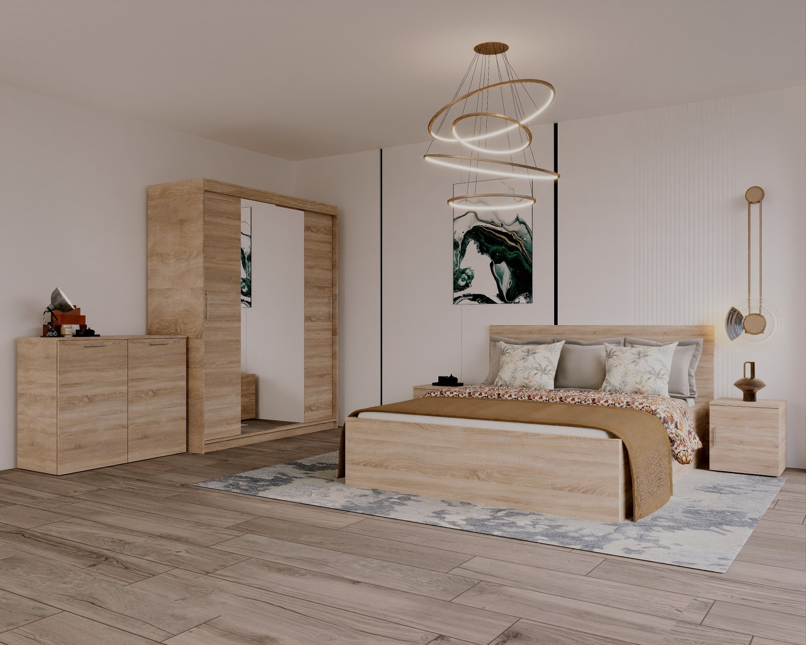 Mobysa Set Dormitor Elis cu oglinda, 180x200cm, Sonoma, Pal 18 mm