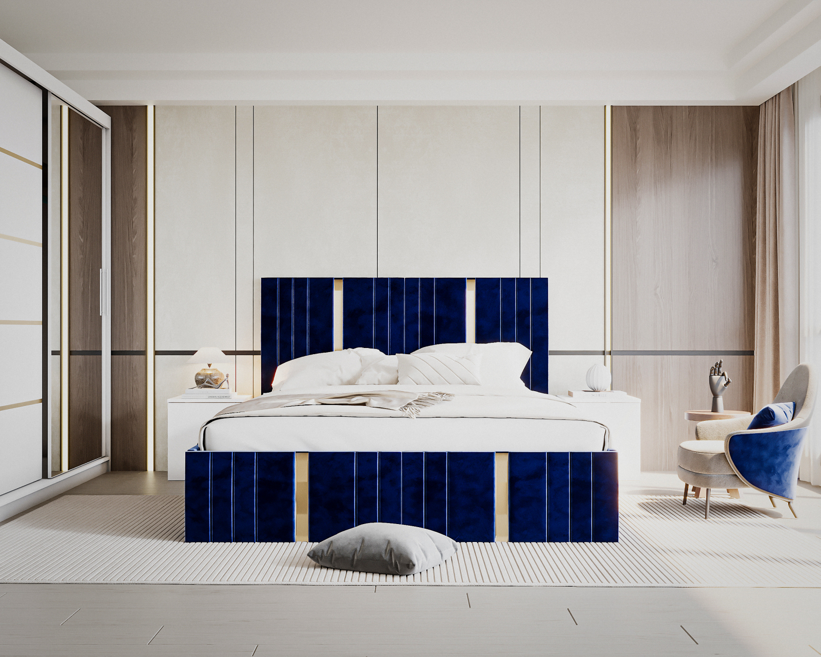 Mobysa Set Dormitor Sebastian auriu cu oglinda, Pat 160x200cm, Albastru + Alb, Pal 18 mm